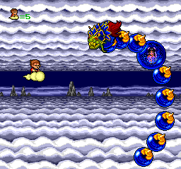 advancing further may prove slim, as the monsters will shrug off your pellet fire without even a grimace. A one-life run is your best bet for winning and having fun while doing so, and to that end, I suggest acquiring the mini-cloud-guy option buddies as soon as possible.