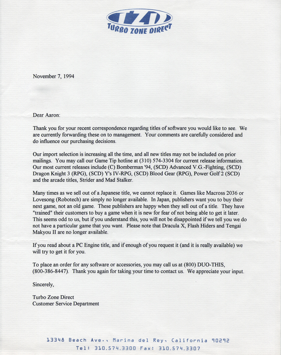 Reply from Turbo Zone Direct regarding stocking out of print import games (circa November 1994).