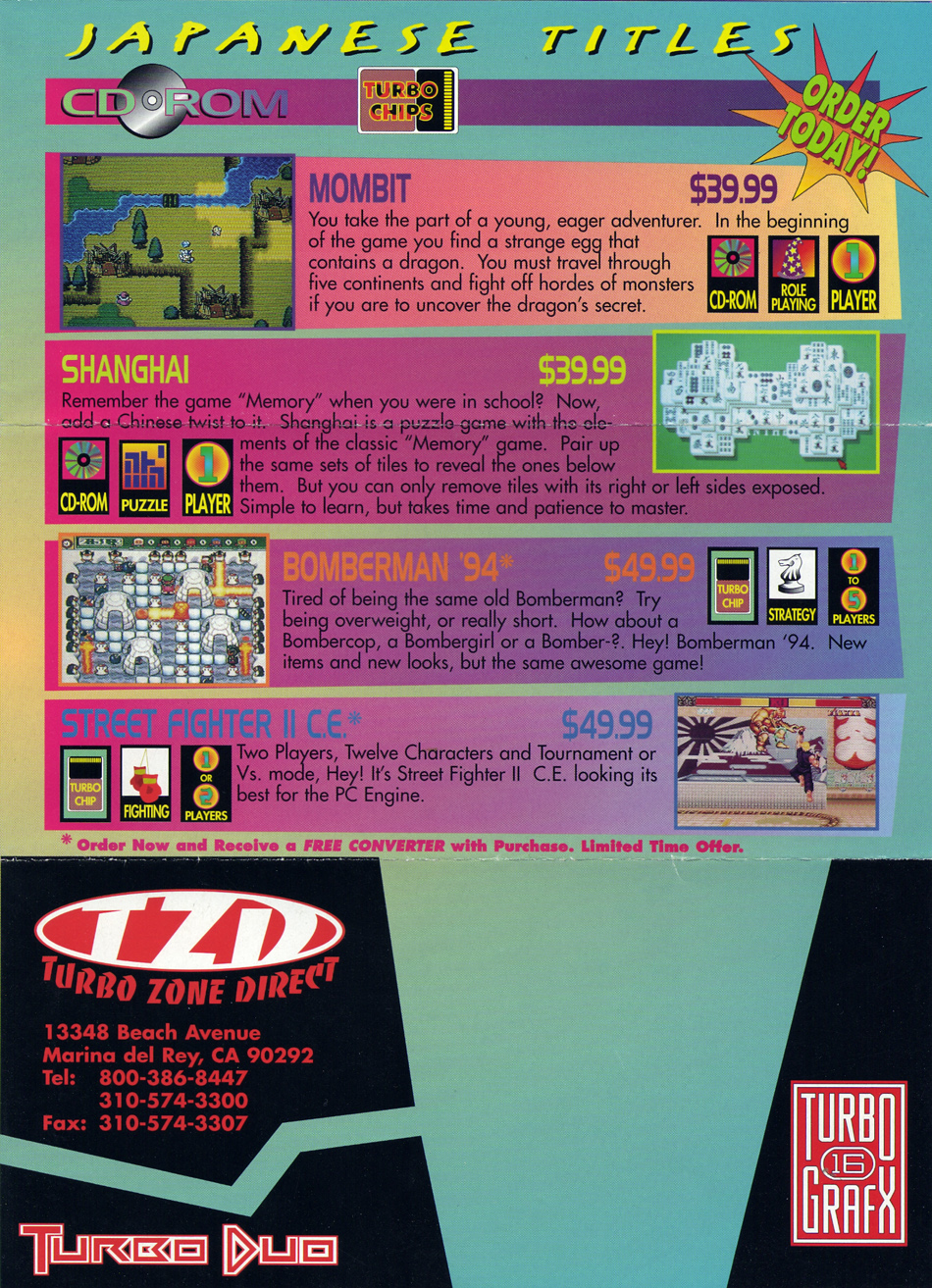 Flyer from Turbo Zone Direct focusing on import titles (unknown date). One of the amazing deals from this flyer was the free converter with purchase of either Street Fighter II or Bomberman ‘94.