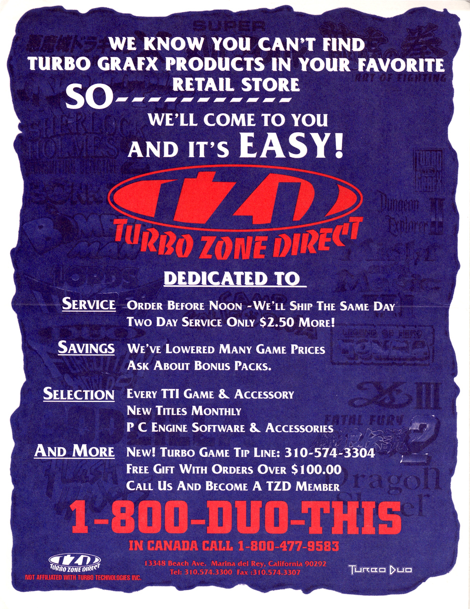 One of the first mail flyers from Turbo Zone Direct (unknown date). In this flyer just some of the rarer items available were Dracula X ($79.99), Arcade Card ($149.99) and Flash Hiders ($79.99).