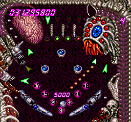 I wasn't particularly happy the day I lugged Alien Crush home with me. I had journeyed to the local game store with the intention of picking up the famously intense Blazing Lazers, but some other Turbo-owning bums had apparently beaten me to the punch, as Compile's blaster was no longer in stock. A pinball game, regardless of the theme it was built on and the embellishments it was adorned with, seemed like a rather poor substitute. But it took only a few minutes of ball-and-flippers-style outer-space-creature annihilation for AC to ingratiate itself with me, and presently I find it anything but shameful that this game and its followup, a duo of thematically intense pinball titles, were among the system's most well-received releases.