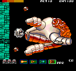 That's all nice. What isn't nice is the control scheme, which practically cries out for an additional button (the same trigger is used for both strafing and switching weapons). Also, the old combination of gigantic hitbox and large projectiles never makes for smooth gameplay, and the fact that you'll often find yourself in very tight corridors doesn't help matters. Some of the mazelike areas can be a bit boring, especially when they force you to undertake the laborious task of tunneling through walls. And while the variety in level design helps keep things fresh, twenty-five boards is just too many. It's not that the levels require much time--many can be completed quite quickly, in fact--but that it can be annoying to reach the Big Arm Boss in Area 25, lose, and then have to fight through the twenty-four previous stages again in order to get another crack at him.