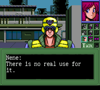 The graphics are decent enough for a HuCard, although it does have that NES look to some of the backgrounds (I assume they were saving memory for the bike chase part and the fight scenes later on). One thing that the game could have used is some more art of the main girls or at least bigger portraits, I felt like I barely saw them by the time I had finished. The maze part has the nicest graphics in the game and actually looks pretty cool, although it could have used more than 2 different robot types to fight and maybe a palette swap or something on the different floors.
