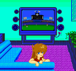 - The action occasionally switches over to scenes of some strange girl watching the games on TV. She puts on various weird outfits and cheers you on or bemoans your lack of success. Sometimes, she dons a baseball uniform of her own and jumps up and down;