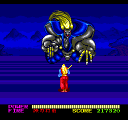 I don't think I've ever seen anything even remotely positive written about this into-the-screen dash-and-shoot game. After just a few minutes of playing it, I was ready to join the crowd and rip it for its many apparent flaws. The animation and Space Harrier-type field scrolling were choppy as hell, and huge doses of slowdown and flicker didn't help matters at all. The weaponry seemed inadequate, as I started off with nothing but a sword-swipe attack, and minor upgrades that allowed my blade to emit little projectiles didn't seem particularly helpful or impressive. Worst of all, the controls felt extremely shoddy.