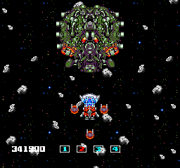 the worst thing to do. The enemy leader in Stage 3 shoots long, shot-blocking lasers that crisscross the screen; if you decide to run around like a chicken with its head cut off, you won't stand a chance.